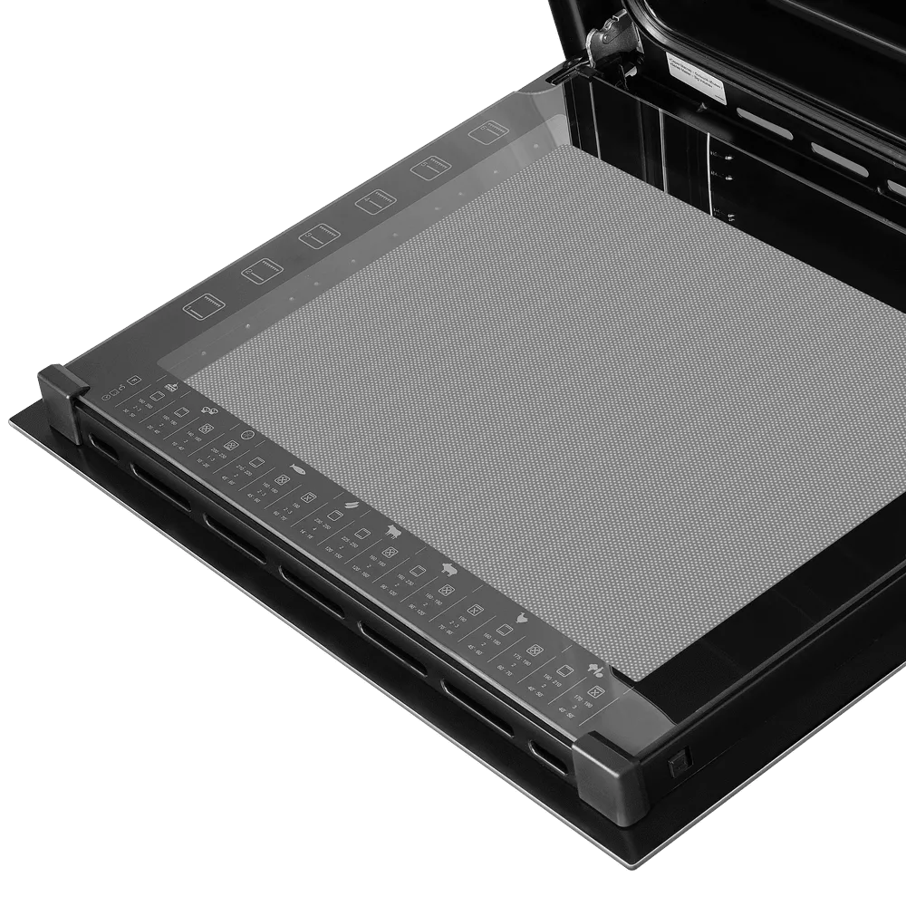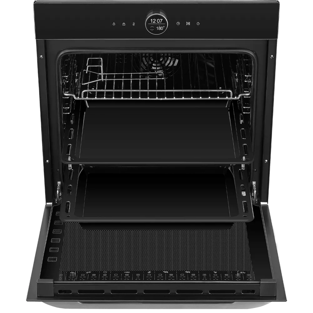 Двухуровневые телескопические направляющие делают извлечение противней безопасным и удобным: выдвигайте горячий противень, проверяйте степень готовности и добавляйте соусы без риска обжечься. Технология «Холодный фронт» бережёт ваши руки и кухонную мебель, сводя нагрев внешнего стекла к минимуму.